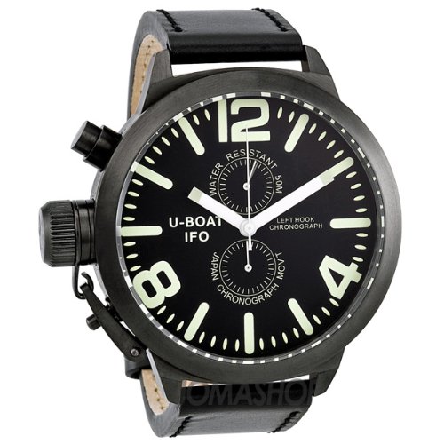 . Black PVD stainless steel case with a black leather strap. Fixed black pv bezel. Black dial with white hands and index hour markers. Arabic numerals mark the 4, 8 and 12 o'clock positions. Minute markers around the outer rim. Dial Type: Analog. Luminescent hands. Chronograph - two sub-dials displaying: 60 second and 60 minute. Quartz movement. Scratch resistant sapphire crystal. Lefty crown. Solid case back. Case diameter: 48 mm. Case thickness: 13 mm. Round case shape. Band width: 22 mm. Triple folding clasp clasp. Water resistant at 50 meters / 165 feet. Functions: chronograph, hour, minute, second. Additional Info: includes extra leather strap. Luxury watch style. U-boat Black Dial Leather Mens Watch 363.
