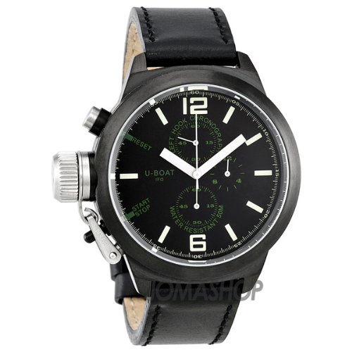 Black PVD stainless steel case with a black leather strap. Fixed black PVD bezel. Black dial with silver-tone hands and index hour markers. Arabic numerals mark the 6 and 12 o'clock positions. Minute markers around the outer rim. Dial Type: Analog. Chronograph - three sub-dials displaying: 60 second, 60 minute and 12 hour. Quartz movement. Scratch resistant sapphire crystal. Lefty crown. Solid case back. Case diameter: 45 mm. Case thickness: 13mm. Round case shape. Band width: 20 mm. Triple folding deployment clasp. Water resistant at 50 meters / 165 feet. Functions: chronograph, date, hour, minute, second. U-Boat Black Green Dial Leather Strap Mens Watch 293.