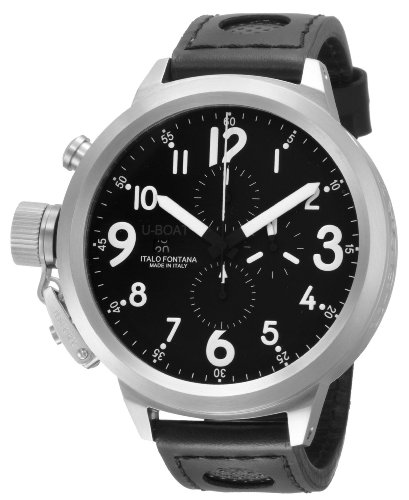 The U-Boat Men's Flightdeck Watch boasts contemporary chronograph features with progressive styling, like an oversized black dial and a calfskin band with carbon inserts that closes with a traditional buckle. The black dial boasts white Arabic hour markers and hands and three subdials at the three, six, and twelve o'clock positions. A date window at the nine o'clock position helps you keep tabs on your busy schedule. At the nine o'clock position is a subtle reminder that this attractive timepiece was made in Italy. The dial is protected by an antireflective sapphire crystal and backed by a stainless steel case. Other features include water-resistance to 330 feet (100 meters) and Swiss automatic movement, a feature that means this watch will never need a battery as it's powered by the movement of your arm.